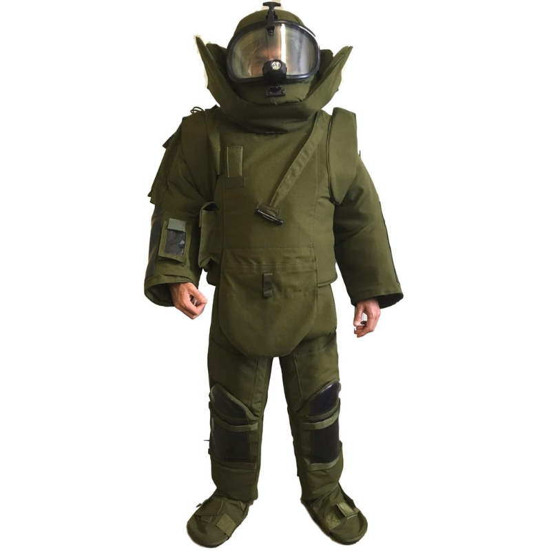 Our blast-resistant ensemble consists of a lightweight demining suit featuring fragmentation and blast-resistant helmet plus a visor, vest, and shin guards.